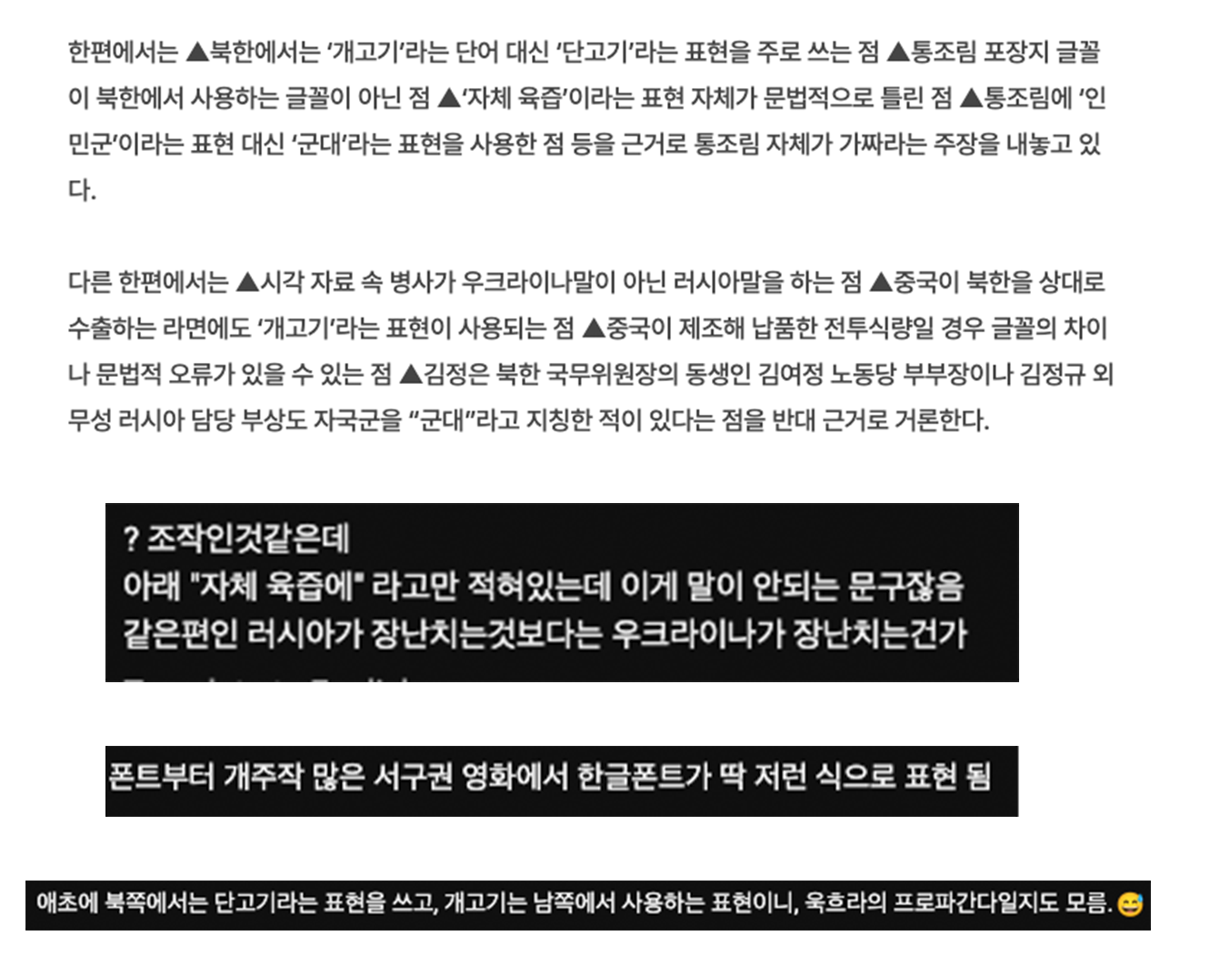 Korean language users analyzed linguistic differences between North and South Korean terms for “dog meat” (‘단고기’ vs. ‘개고기’) and question the authenticity of certain content that uses these terms. They point out that unusual phrasing like ‘자체 육중에’ could indicate manipulation or errors in text that suggest Russian rather than Ukrainian involvement, raising suspicions of propaganda or fabrication. Additionally, references to North Korean defectors and potential discrepancies in broadcast language hint at possible intentional tampering with content to influence perception or spread disinformation.