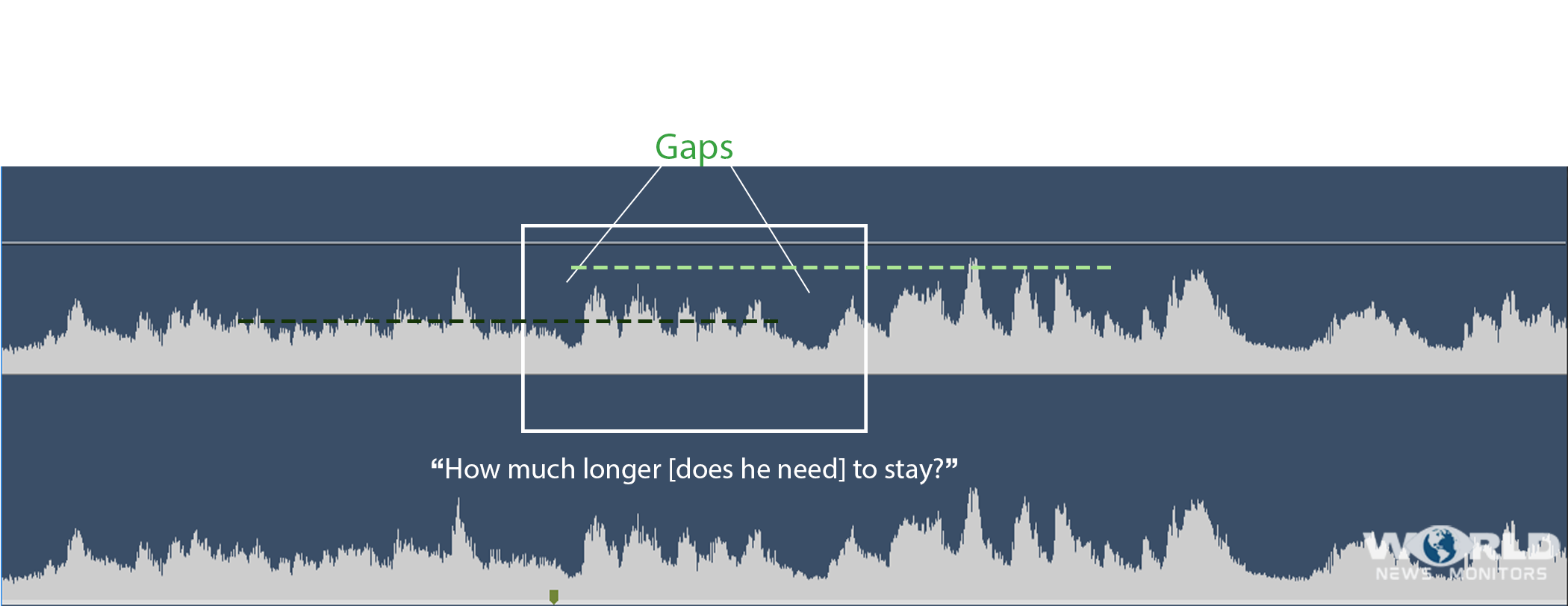 However, the dialogue between, presumably, Kadyrov and the doctor didn’t remain unaltered. This becomes evident at 0:00:14 when the doctor is asked, “For how much longer will the patient stay in the hospital?” To which the doctor responds, “Well, today is the 20th of September, 2 more weeks.” What raises suspicion is the audio waveform, where it appears that Kadyrov’s statement was inserted between the doctor’s response. Another significant detail supporting this hypothesis is the presence of sounds from medical equipment in the audio track; however, the pattern (the time intervals between two beeps) has been disrupted.
