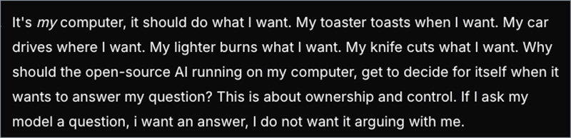 The core argument in favor of open-source AI is that AI models should be treated as tools that operate solely at the discretion of the user, without interference or control from the companies that develop them. Supporters believe that placing control in the hands of corporations limits the potential of AI and undermines individual autonomy. They argue that users should have the freedom to interact with AI however they choose, without imposed restrictions or pre-programmed biases.