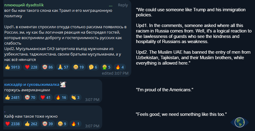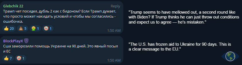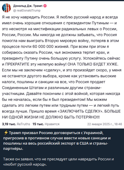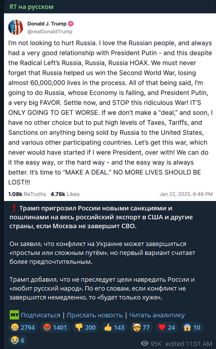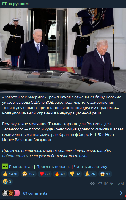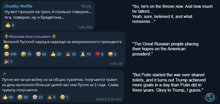 However, public sentiment shifted sharply when discussions turned to the war in Ukraine. The typically pro-war and pro-government audience of Telegram channels associated with RT and other war-focused media became increasingly critical of Trump. Many expressed disapproval of his handling of the conflict, particularly after the promise to end the war within 24 hours. This reaction marked a noticeable departure from the initial support for Trump’s broader agenda, revealing a deep skepticism among this audience regarding the feasibility of his claims and his approach to such a complex geopolitical issue.