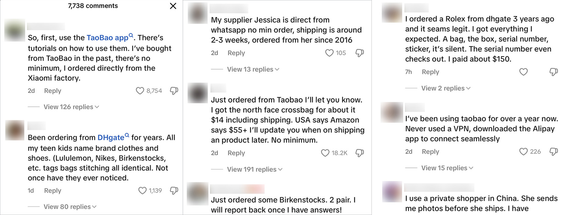 The posts triggered a tidal wave of engagement. Comments reveal a growing awareness—and disillusionment—with branded retail pricing. “Been ordering from DHgate for years… tags, bags, stitching all identical.” “Just ordered from Taobao, got it for $14. Amazon wants $55.” “My supplier Jessica is direct from WhatsApp… no minimum order.” These anecdotes highlight how consumers are educating each other in real time, sharing contact info for private sellers, tutorials for using Chinese apps, and stories of navigating customs. Some even admit to buying counterfeit luxury goods. The line between bargain-hunting and intellectual property theft is increasingly blurred.