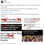 The primary narrative in anti-election posts centered on allegations of fraud, asserting that the Iranian elections could not be free or fair due to the nature of the regime. These posts described the elections as a “sham” and an “election circus,” and labeled Pezeshkian as a “puppet.” The hashtags commonly used in these posts were:
