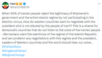 Tweet that brings up the problem of the people will in Iran and blames Western countries for not cooperating. (Source: X)
