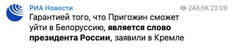 Text: “The guarantee that Prigozhin will be able to leave for Belarus is the word of the president of Russia, the Kremlin said.”