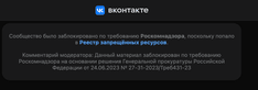 Text: “The community was blocked at the request of Roskomnadzor [Federal Service for Supervision of Communications, Information Technology and Mass Media] because it was included in the Registry of Banned Resources.