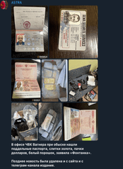 Text: “At the office of PMC ‘Wagner,’ the fake passports, golden bars, dollar packs, and white powder were found,” Fontanka [Internet-newspaper of Saint-Petersburg] stated. Later, the article was deleted from both the website and Telegram channel of the news outlet.