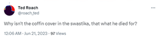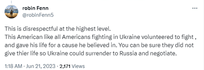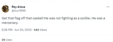 Social media users decried the presence of Americans in the war in Ukraine, questioning the basis on which the soldier ended up in the war and condemning the idea of mercenaryism, speaking of its ignobleness. Twitter user “Tony Wright” (@Tony77377Codolo) stated that nobody made the soldier go to war[1] and user “Bent banana” (@BentBananabent6) supported that opinion, writing “no empathy from me.”[2] Commentators pointed out that there is no official deployment of troops in Ukraine and called for taking the flag off the coffin. [3]