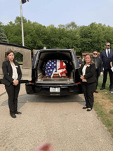 The picture displays a funeral car allegedly with a body of a soldier came back from Ukraine. The car has an Illinois public transportation vehicle plate with a new 2023 registration sticker.[12]