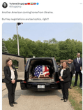 Thus, the Twitter picture is representing the funeral procession of an American soldier who died in the war in Ukraine. We know from news articles that he volunteered to fight, and the American flag is explained by his previous service in the American military.