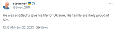 As the account is believed to be pro-Russian, most of the points expressed are aligned with the Russian perspective. Thus, users celebrated the loss of the soldier and blamed the United States and NATO for “meaningless” casualties.