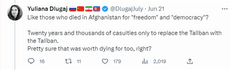The thread author “Yuliana Dlugaj” replied to a comment, decrying US military presence in other conflict zones.[6]