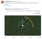 “Most honorable and prestigious entity to create an account on X. Praise to Allah for the blessing of Al-Qassam.”